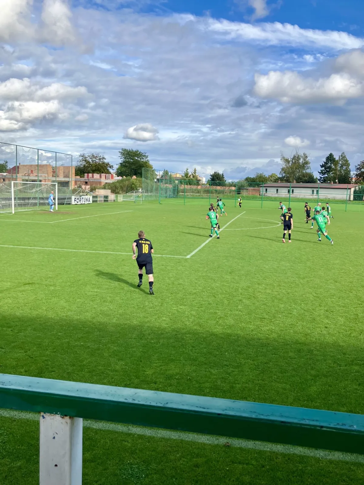 Ve 36. minutě jsme kopali rohový kop. Na přesný centr – snad první v utkání – si na zadní tyči naběhl nikým neatakovaný kapitán Zdenda Tauchman a placírkou doklepl míč za záda nereagujícího veterána Maška – 0:1. Domácí se tlačili za vyrovnáním, ale naše defenziva pracovala velmi spolehlivě a co prošlo, posbíral jistý gólman Dan Navrátil.